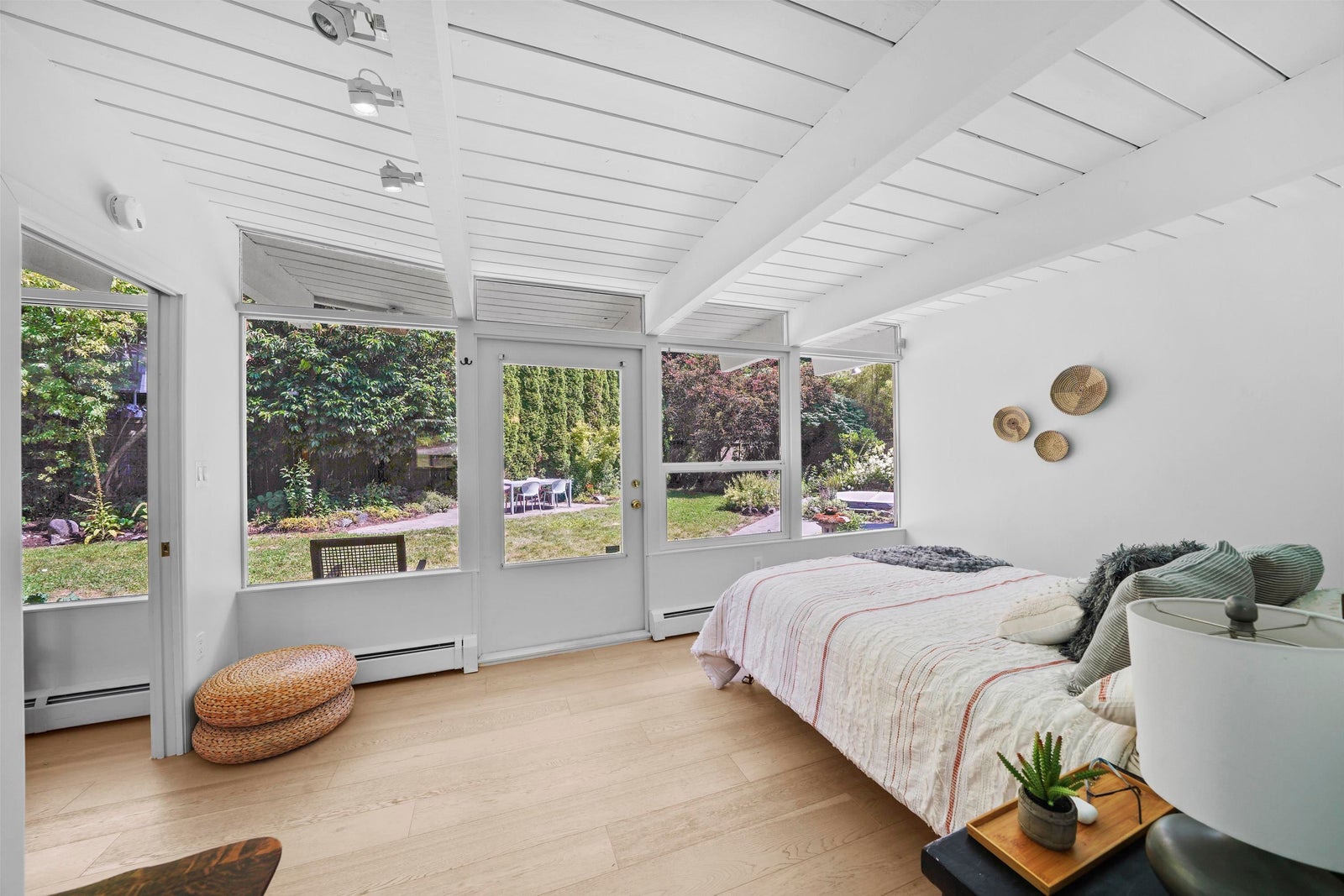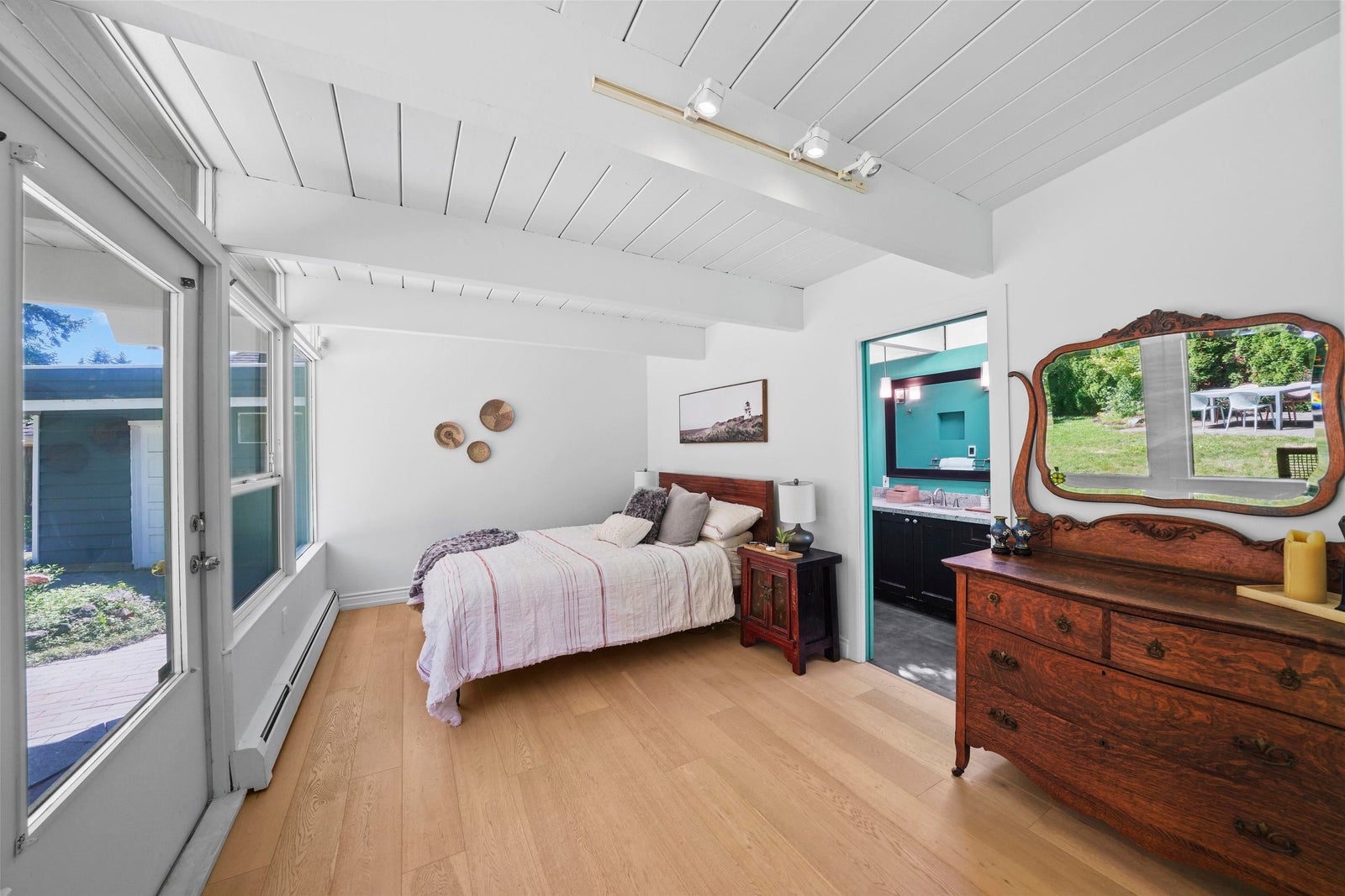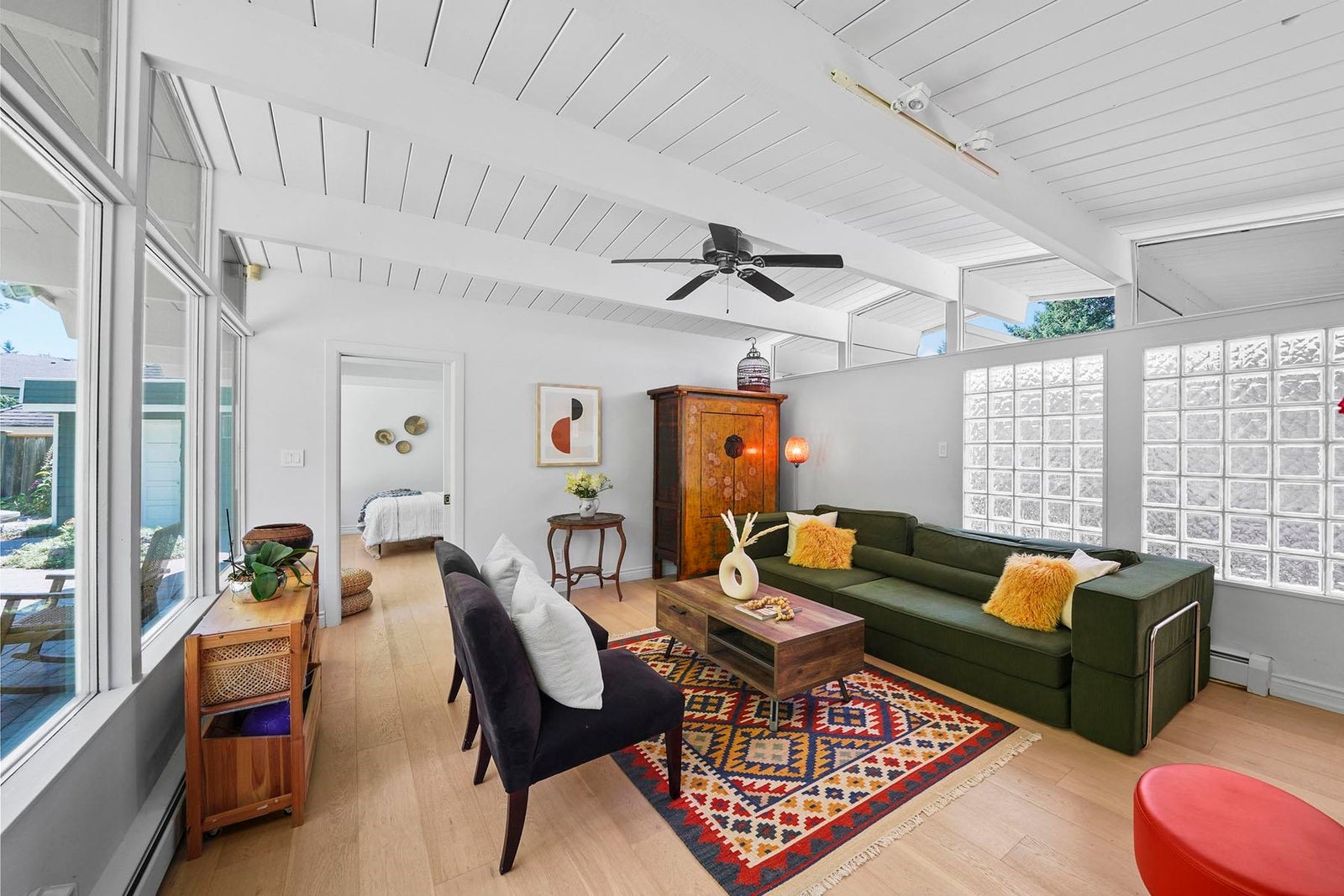 Renowned designer and builder Bob Lewis created this quintessential West Coast Modern post-and-beam rancher for Dr. D. Gibson with a family of 10. Hidden among the lush private gardens and lawns of an 11,500 sf lot in Sunshine Hills, light pours through 20 large windows. The home has been thoughtfully renovated over time, most recently in 2020 with a kitchen both stylish and functional, Duro-Tuff membrane cool roof, and wide-plank flooring. Features also include a Miele combi-steam oven, 200A electrical service, 2-car garage with EV-ready receptacle, large shed, and drip irrigation for convenience. Grow food or flowers in raised beds within the landscape. Walk to Watershed Park. Easy access to Hwy 99/91. Catchment for IB program at Seaquam. Timeless design and modern living. Welcome home.