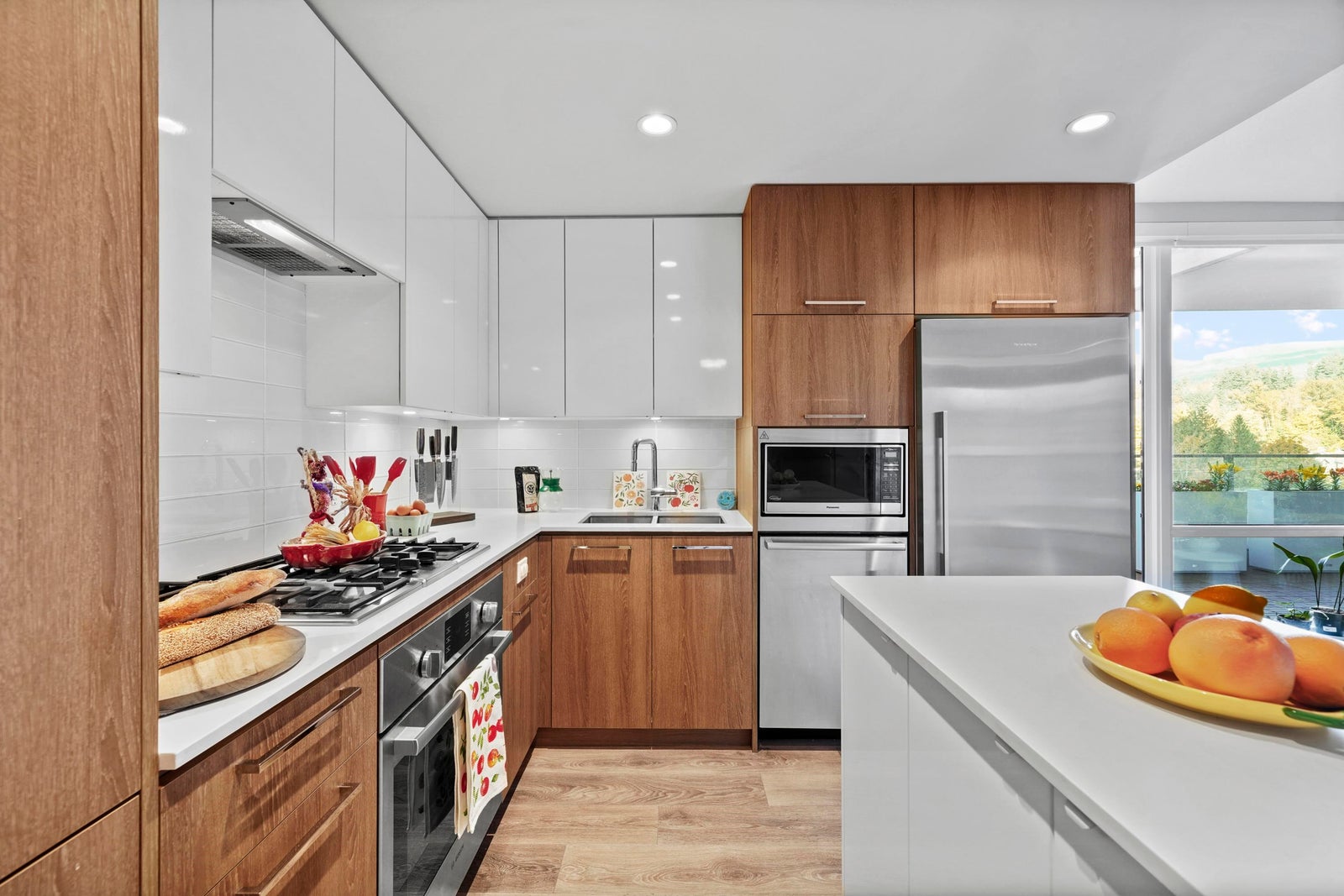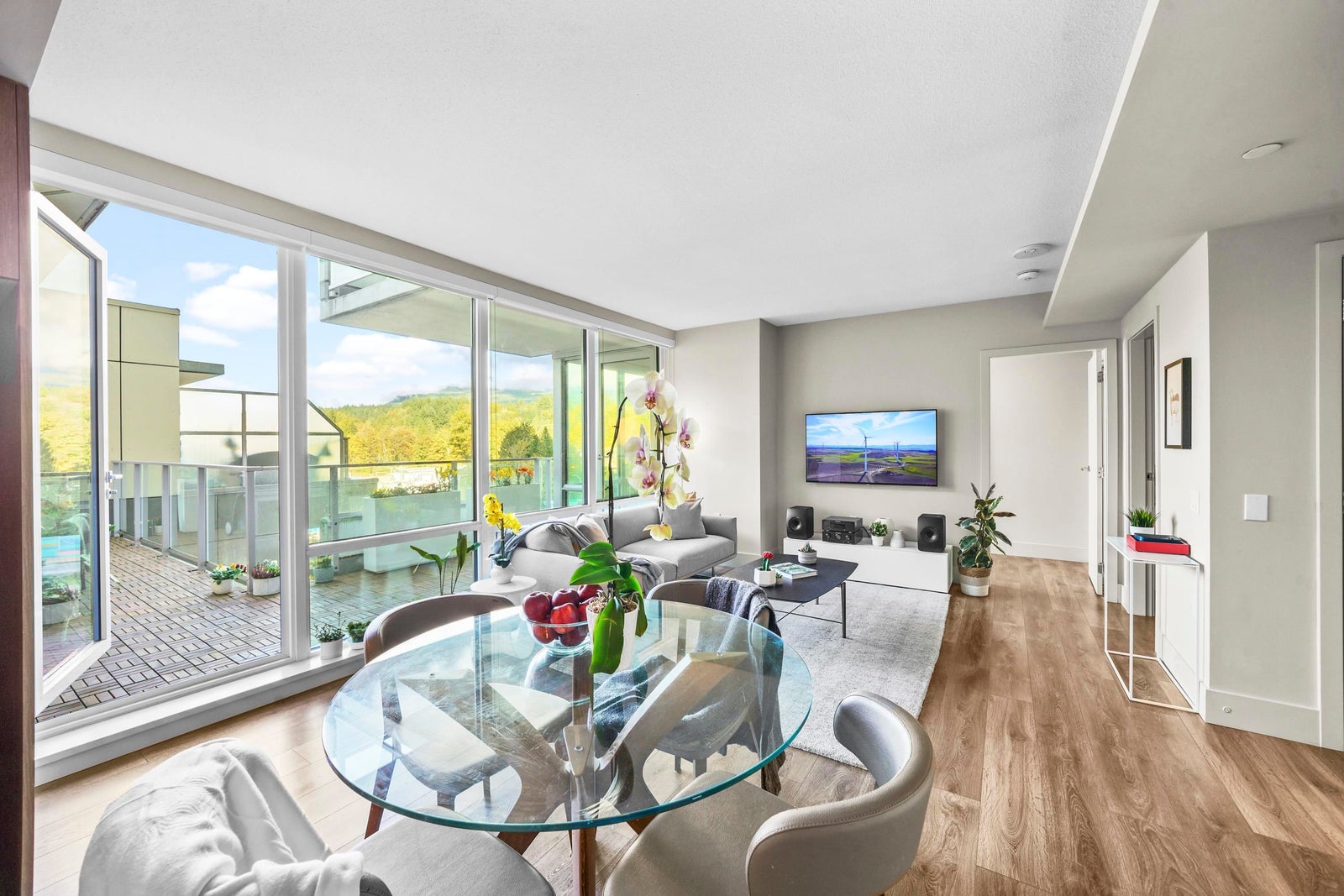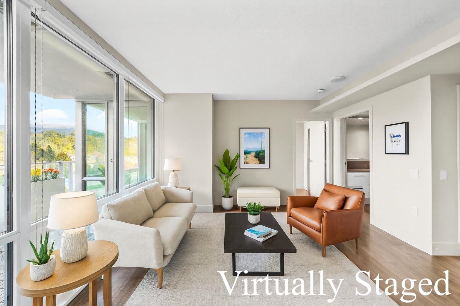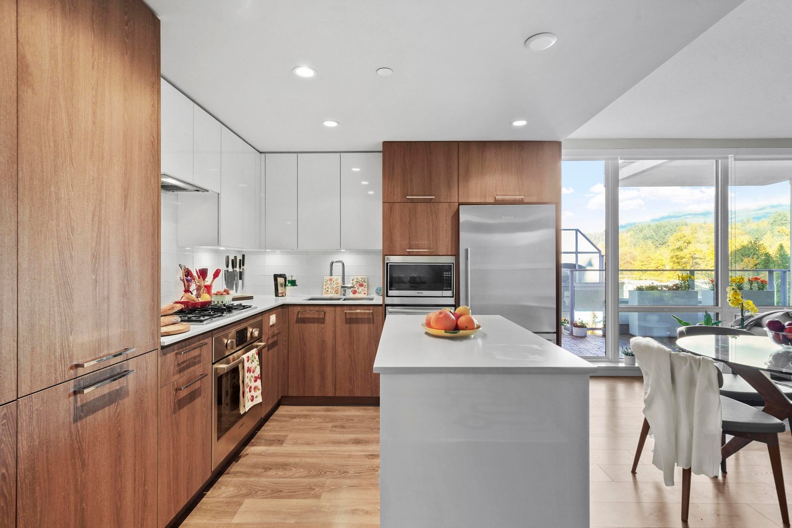 Resort-style living-rare North-facing home: where over-height ceilings & floor-to-ceiling triple pane windows showcase breathtaking mountain views! 1 of only 4 homes of this unique layout, features oversized rooms & expansive 220SF L-shaped balcony—the perfect place to enjoy the morning sunrise or unwind under the evening glow. Bright open-concept offers spacious primary bedrm w/ a walk-in closet & a spa-inspired ensuite complete w/ double sinks. Opposite side, a large den easily functions as a 2nd bedroom or home office, a powder room for guests. Chef’s kitchen w/ Bosch gas cooktop, Fisher&Paykel S/S refrigerator, modern backsplash, Quartz countertops & ample custom floor to ceiling cabinetry. A/C, private bike locker, wheelchair accessibility &more! Make this your own NorthShore retreat!