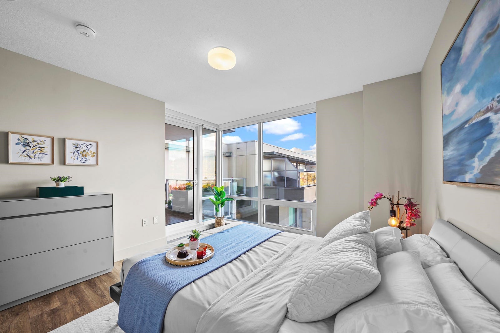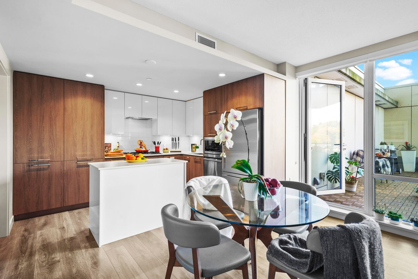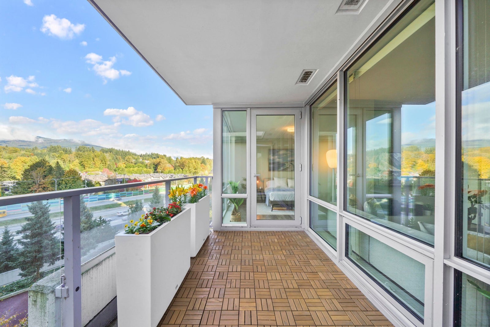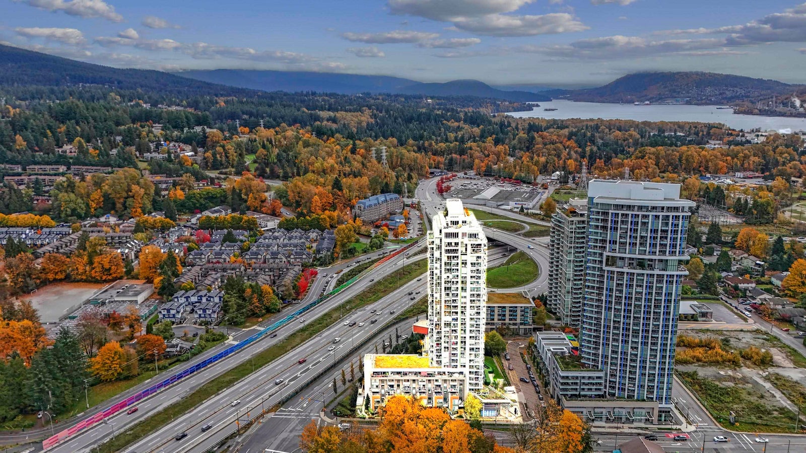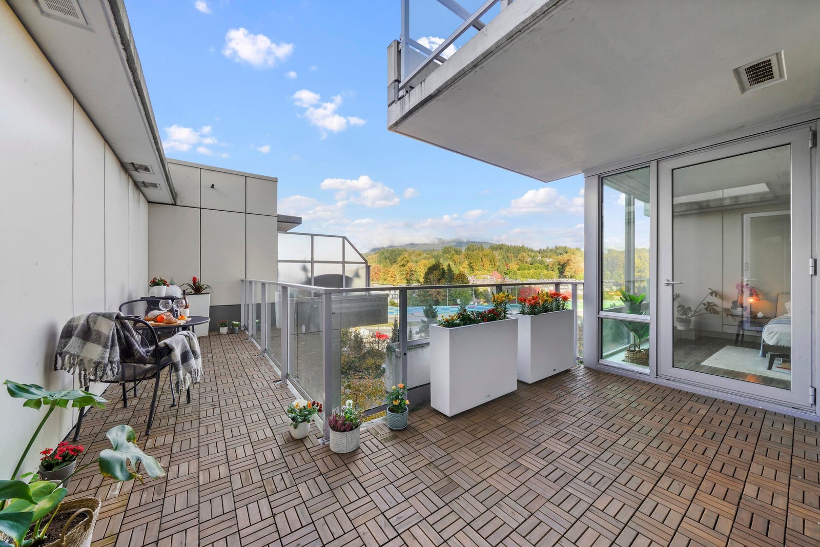 Resort-style living-rare North-facing home: where over-height ceilings & floor-to-ceiling triple pane windows showcase breathtaking mountain views! 1 of only 4 homes of this unique layout, features oversized rooms & expansive 220SF L-shaped balcony—the perfect place to enjoy the morning sunrise or unwind under the evening glow. Bright open-concept offers spacious primary bedrm w/ a walk-in closet & a spa-inspired ensuite complete w/ double sinks. Opposite side, a large den easily functions as a 2nd bedroom or home office, a powder room for guests. Chef’s kitchen w/ Bosch gas cooktop, Fisher&Paykel S/S refrigerator, modern backsplash, Quartz countertops & ample custom floor to ceiling cabinetry. A/C, private bike locker, wheelchair accessibility &more! Make this your own NorthShore retreat!