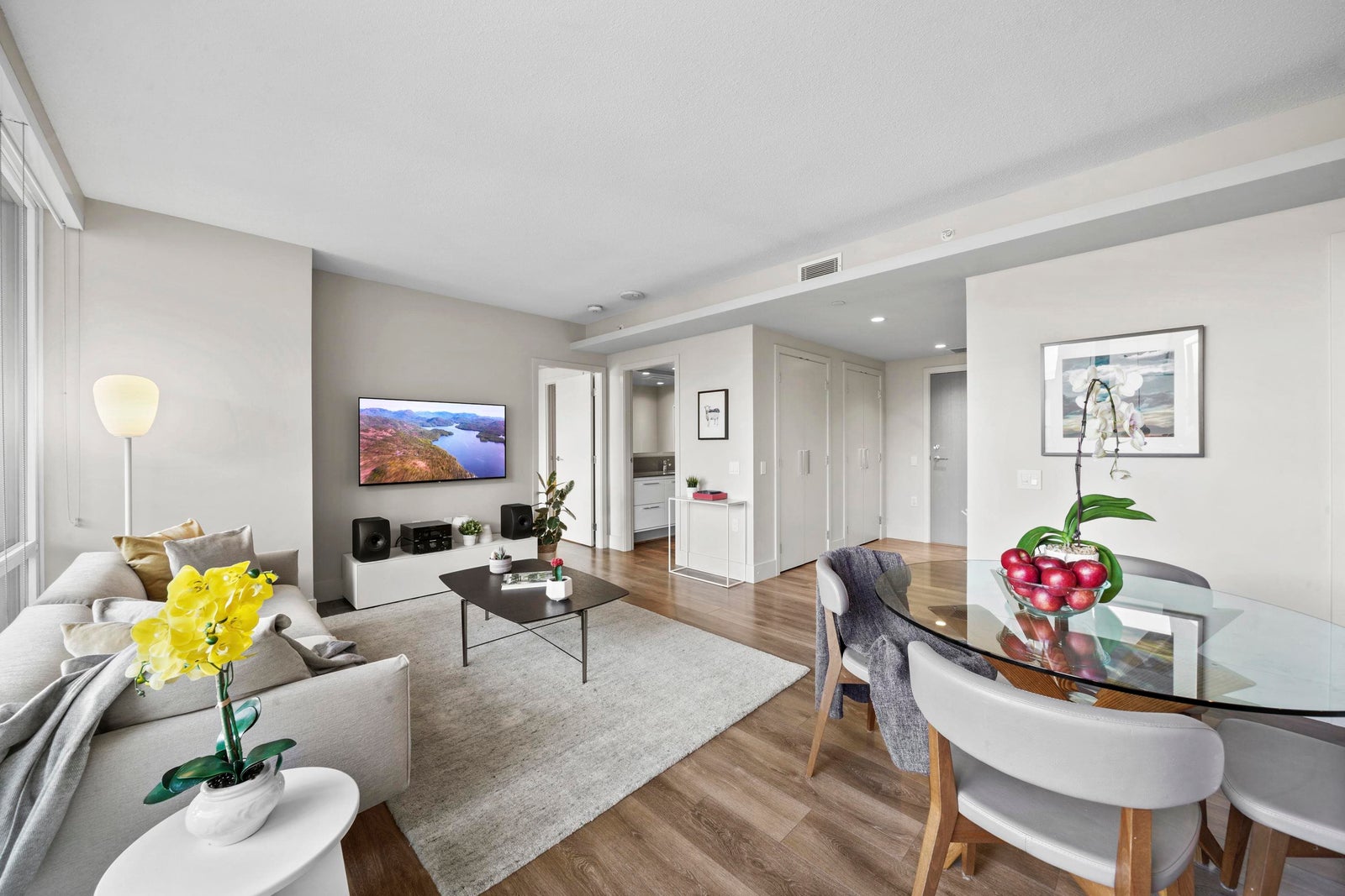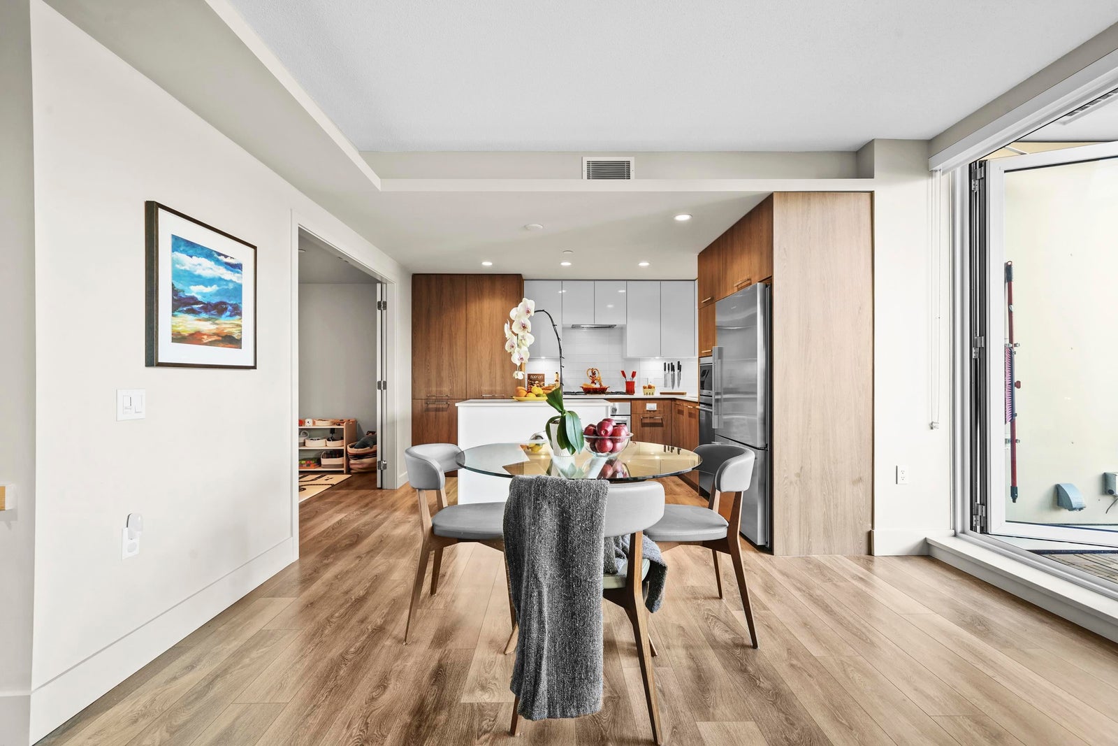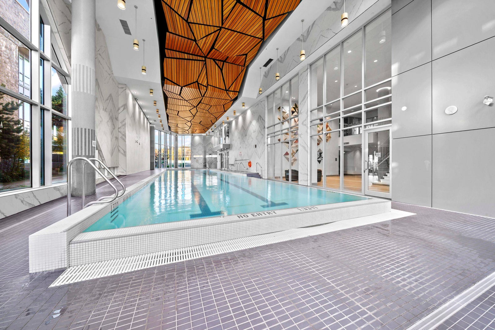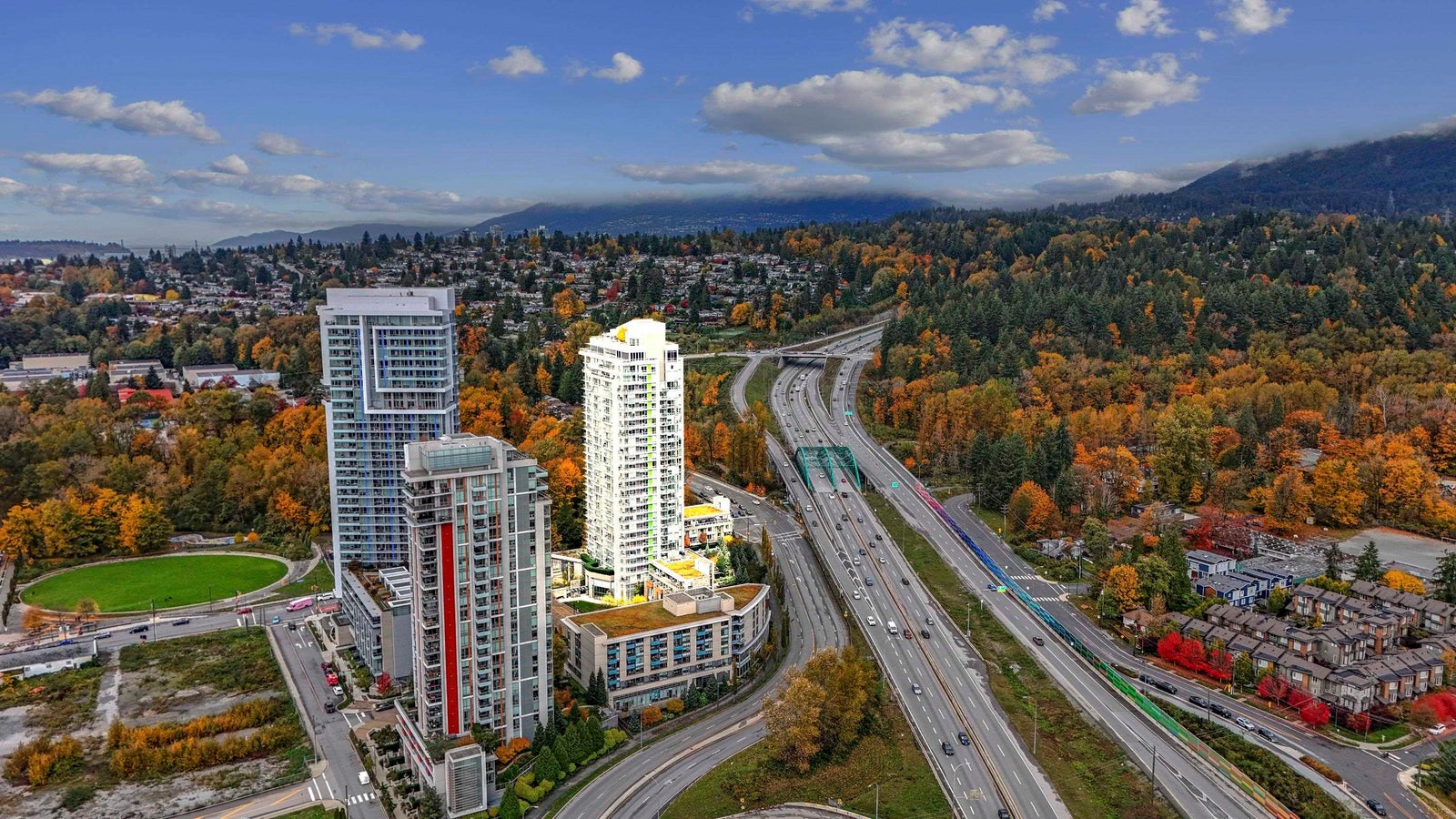 Resort-style living-rare North-facing home: where over-height ceilings & floor-to-ceiling triple pane windows showcase breathtaking mountain views! 1 of only 4 homes of this unique layout, features oversized rooms & expansive 220SF L-shaped balcony—the perfect place to enjoy the morning sunrise or unwind under the evening glow. Bright open-concept offers spacious primary bedrm w/ a walk-in closet & a spa-inspired ensuite complete w/ double sinks. Opposite side, a large den easily functions as a 2nd bedroom or home office, a powder room for guests. Chef’s kitchen w/ Bosch gas cooktop, Fisher&Paykel S/S refrigerator, modern backsplash, Quartz countertops & ample custom floor to ceiling cabinetry. A/C, private bike locker, wheelchair accessibility &more! Make this your own NorthShore retreat!